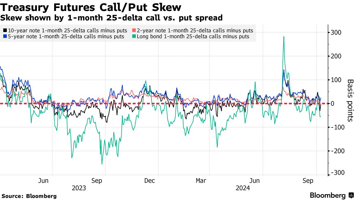 为对冲国债市场支付的溢价再次偏向看跌保护,表明交易者为对冲债券市场的抛售支付了更高的溢价。长端曲线的溢价最为昂贵,表明看跌期权的偏向。此变化捕捉到了市场的抛售,10年期收益率在周二上升至4.05%,为8月初以来的最低水平。