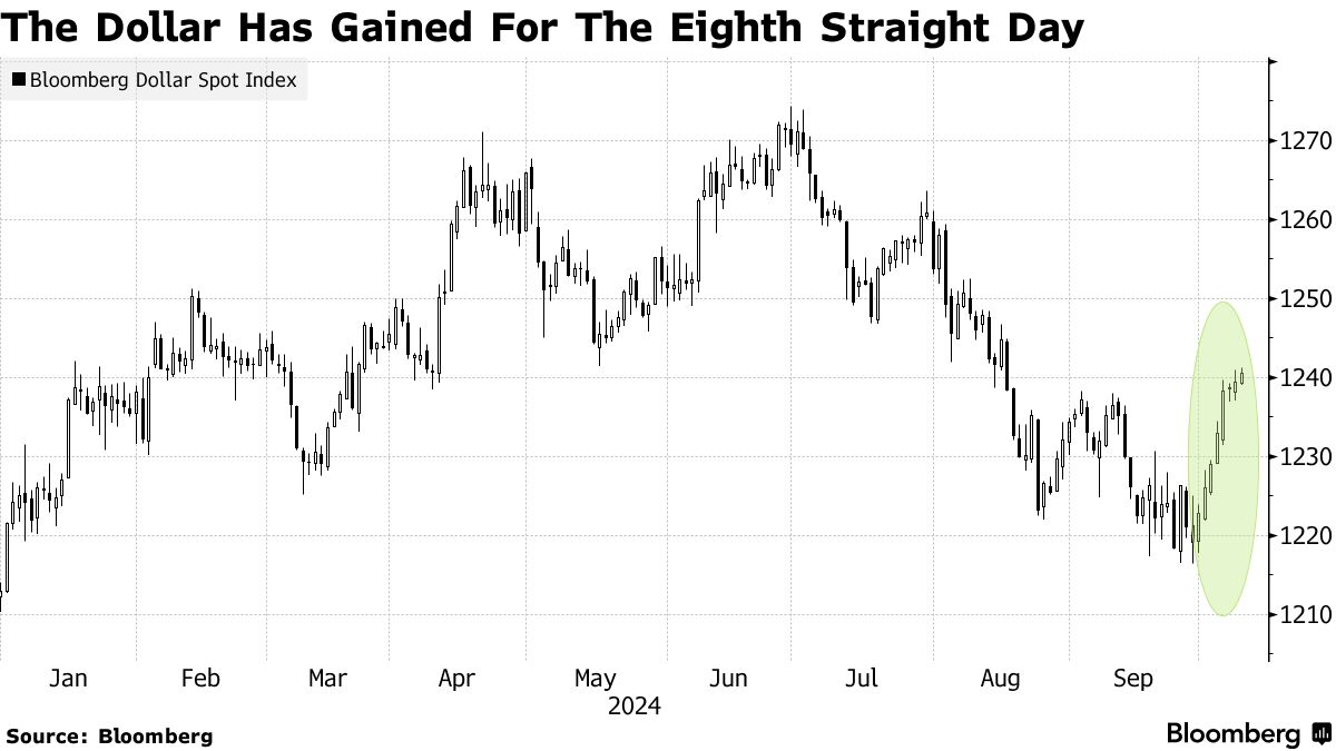彭博美元现货指数已连续上涨八天,创下自2022年4月以来最长的连胜纪录。在上周意外强劲的美国就业报告的推动下,该货币已飙升至自8月中旬以来的最强水平——这促使市场排除了今年再进行50个基点的美联储降息的可能性。