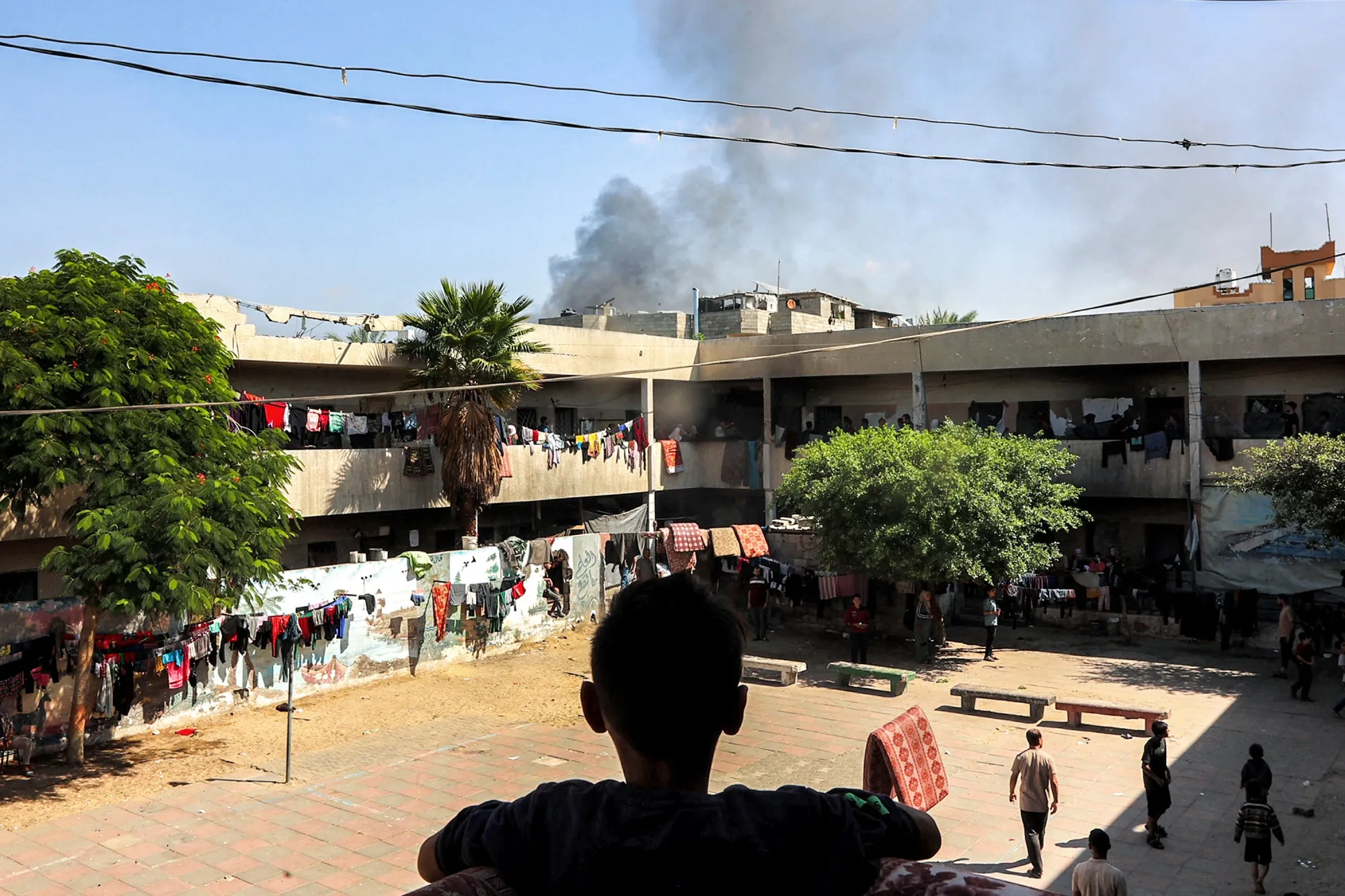 一个男孩在加沙地带北部的贾巴利亚难民营观看烟雾升起,时间是10月9日。