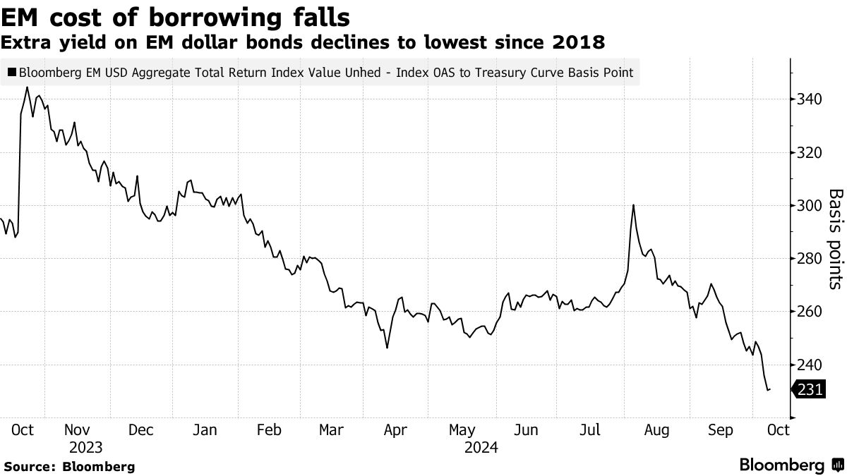 这一预计的纪录,包括主权和企业硬通货发行,正值美国联邦储备委员会最近在四年多以来首次降息,而新兴市场美元债券的额外收益率已降至2018年以来的最低水平。该银行预计2024年的债务发行将打破2020年创下的2650亿美元的纪录,今年迄今已售出2530亿美元。
