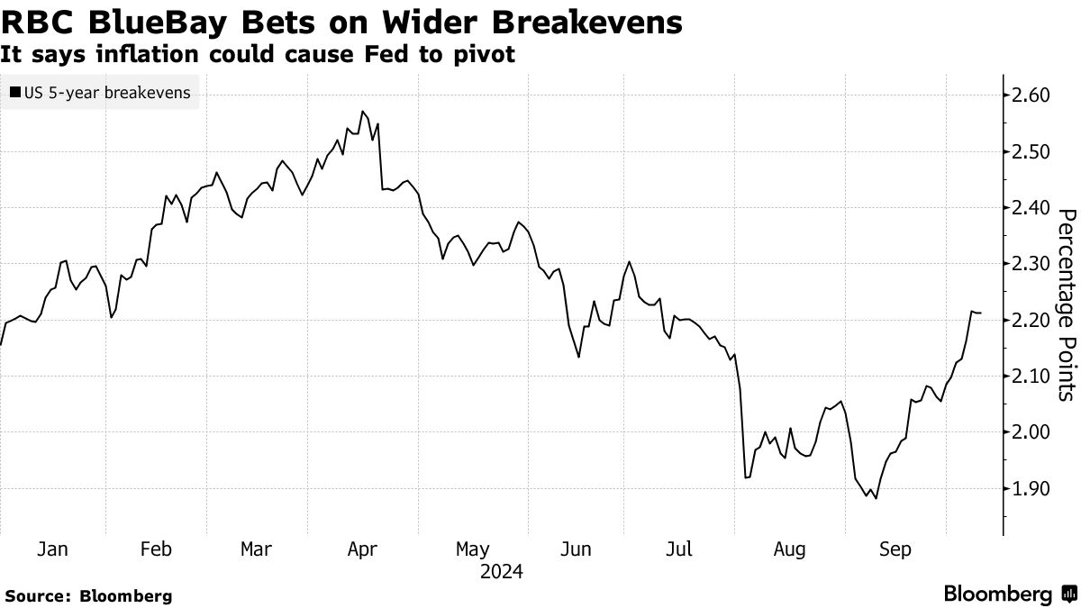 道丁通过为美国 breakeven 利率——通货膨胀预期的代理——进行布局,押注于这一点,以进一步扩大。他还预计,美国国债收益率曲线将急剧陡峭,因为长期收益率上升的速度快于短期收益率。这是因为他认为投资者要求更高的溢价来补偿通货膨胀前景,特别是如果唐纳德·特朗普下个月赢得选举的话。
