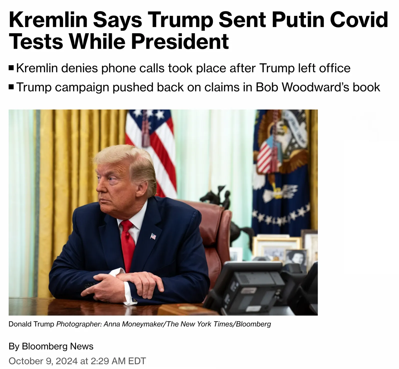 好吧,这很尴尬:在他的新书中,鲍勃·伍德沃德——始终保持沉默的秘密守护者——表示前总统唐纳德·特朗普在疫情初期将COVID检测设备送给他的朋友弗拉基米尔·普京,而许多美国人无法获得这些设备。特朗普的团队坚决否认这些指控,并表示这本书“要么属于折扣书店的虚构类的特价区,要么用作卫生纸。”但在你把伍德沃德的448页巨著带到小男孩的房间之前,要知道俄罗斯人说这是真的: