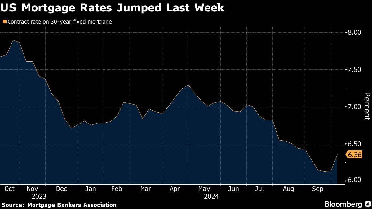 根据周三发布的抵押贷款银行家协会数据,截止到10月4日的一周,30年期抵押贷款的合同利率上升了22个基点,达到了6.36%。该利率现在处于自8月以来的最高水平。