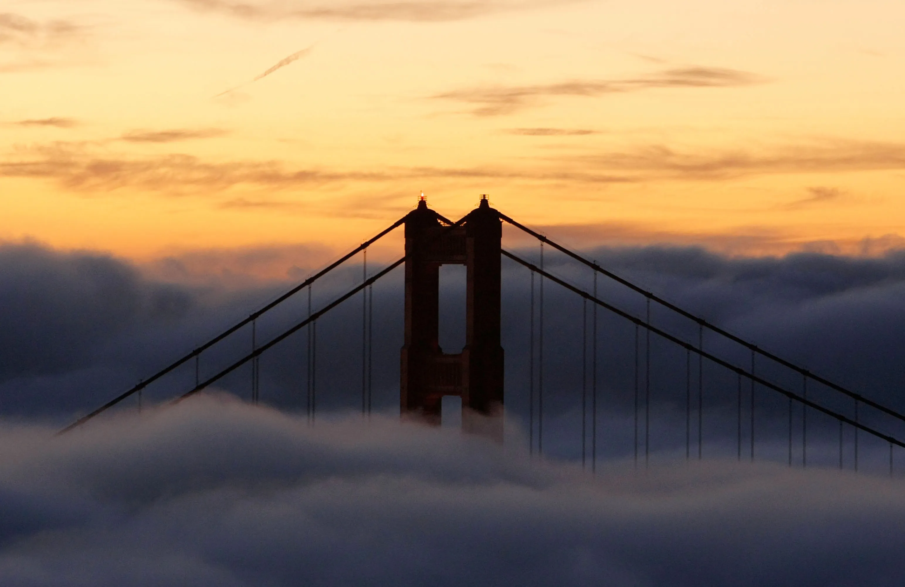 索萨利托,加州 - 10月8日:金门大桥的北塔在2007年10月8日的日出时被雾气笼罩,地点在加利福尼亚州索萨利托。