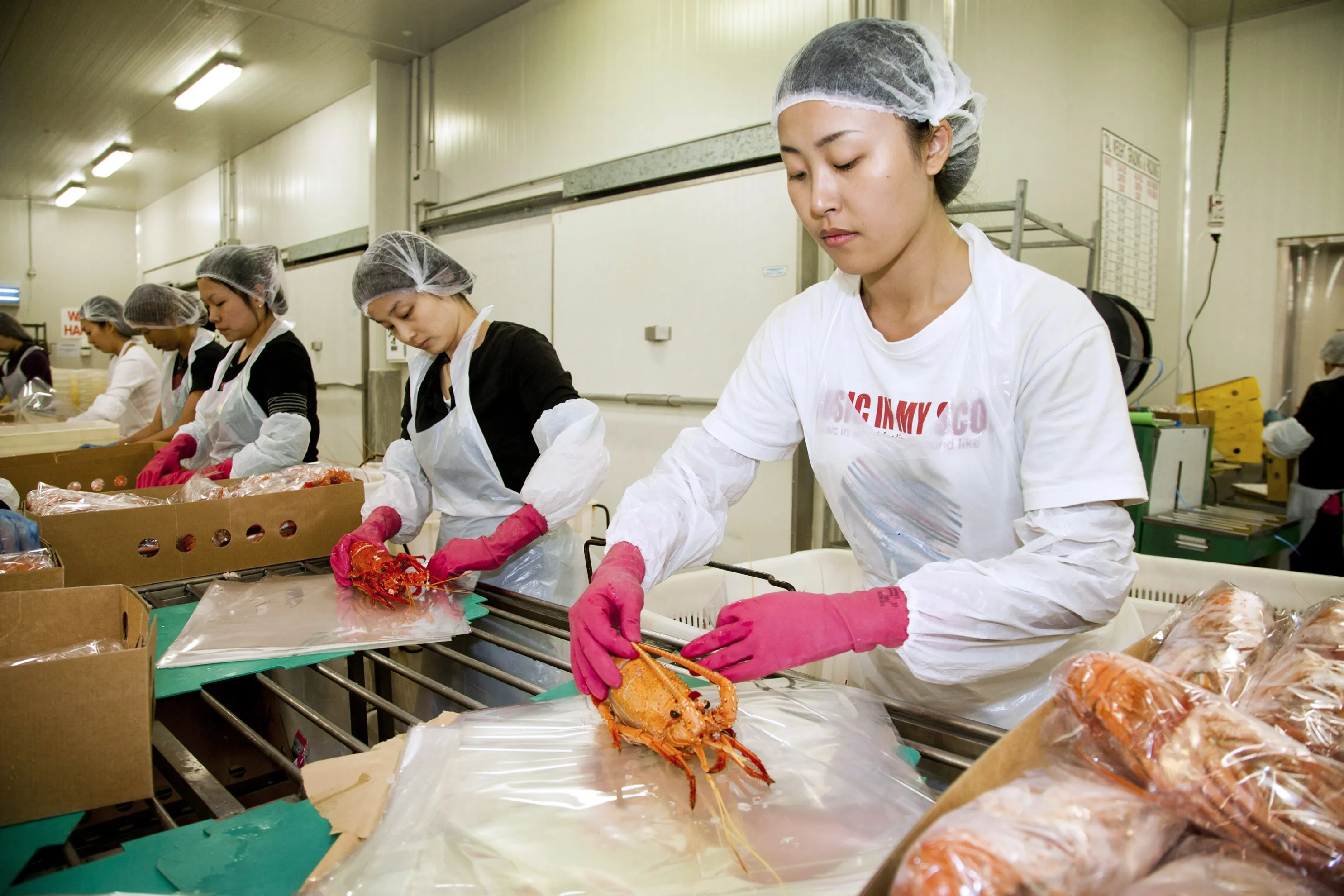 员工米歇尔·王在澳大利亚珀斯的Blu-wave工厂包装新鲜烹饪的岩龙虾。