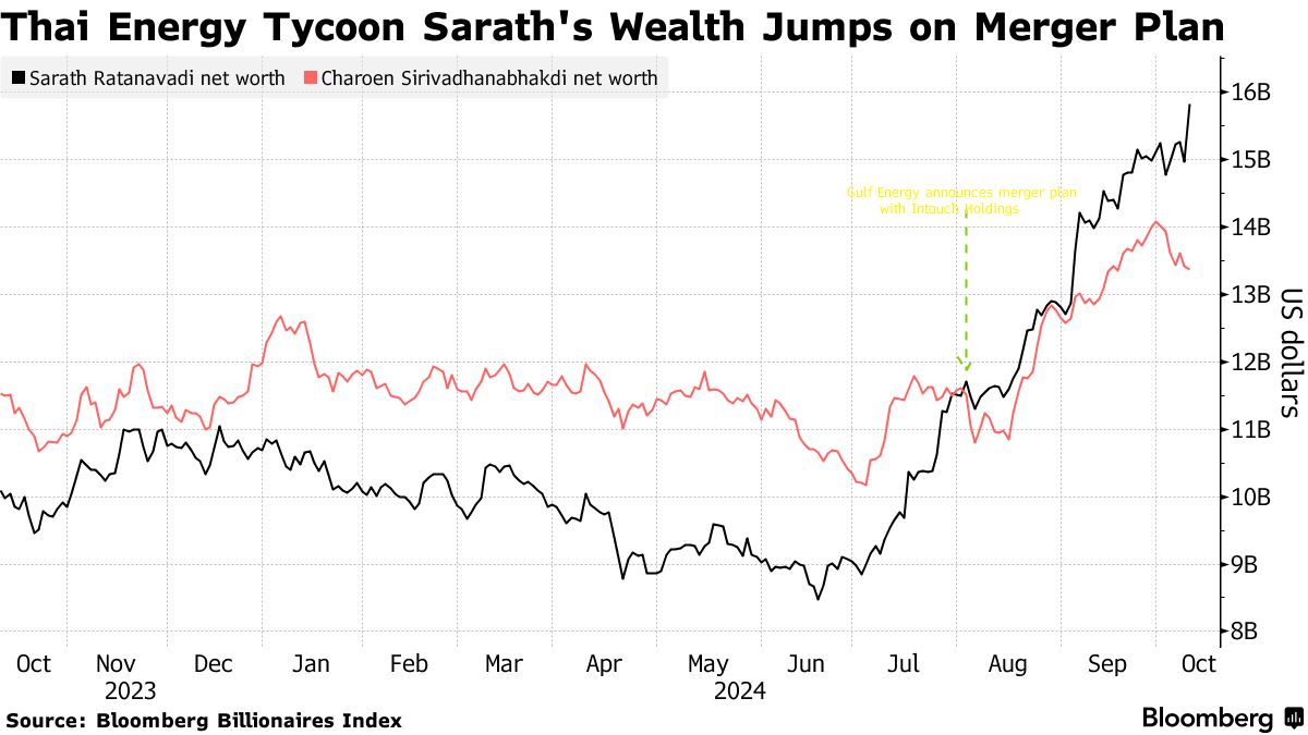 萨拉特在七月底超越了饮料和房地产大亨查伦·西里瓦丹纳帕基迪,80岁,他的净资产为134亿美元,成为彭博亿万富翁指数上最富有的泰国人。提议的合并于7月16日宣布。
