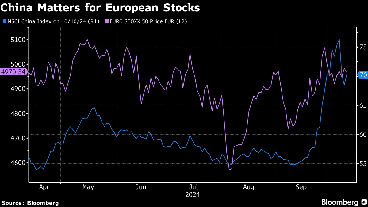 两者之间的联系是不可否认的。暴露于中国市场的欧洲股票约占Euro Stoxx 50的三分之一,并涵盖了广泛的行业——以周期性股票为主,这些股票将依赖于商业周期。这意味着,关键的欧洲公司需要看到中国政策制定者采取能够恢复该国消费者需求的政策。除非中国的增长轨迹明显改善,否则欧洲指数中的防御性偏好将持续存在。