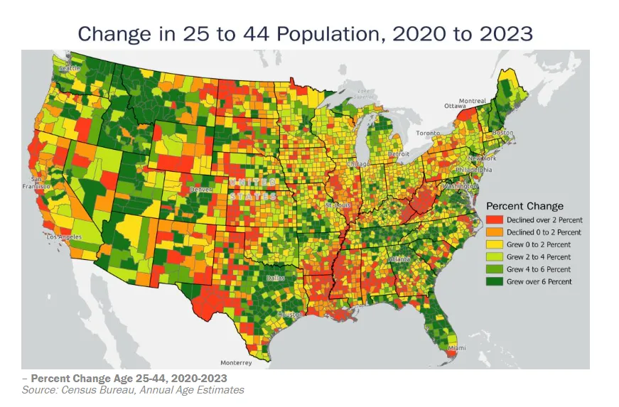 汉密尔顿·隆巴德,弗吉尼亚大学疫情加速了这一趋势,因为远程工作和飙升的房价使年轻人前往意想不到的偏远地方。隆巴德发现,自2020年以来,25至44岁人群中三分之二的人口增长发生在居民少于一百万的城市或农村县。