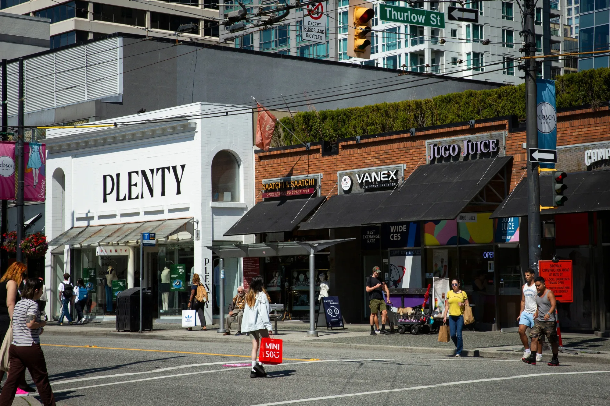 温哥华罗布森街的购物者。零售和批发贸易是九月份就业增长的主要驱动力之一。摄影师:伊莎贝拉·法尔塞蒂/彭博社工资增长也放缓,从之前的4.9%降至4.5%。