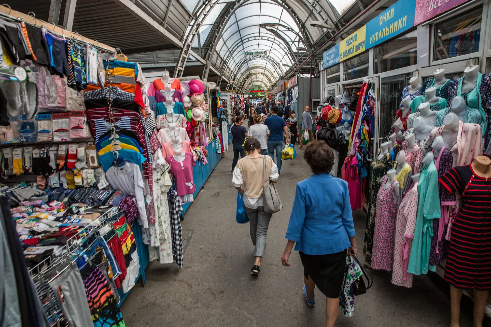 购物者在哈萨克斯坦阿拉木图的绿色集市附近走过。