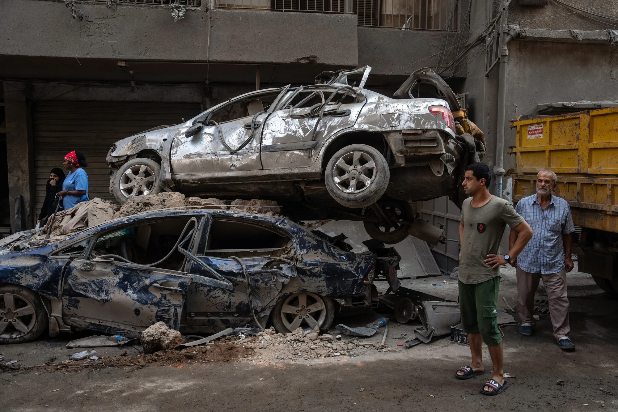 人们站在贝鲁特,黎巴嫩,10月11日以色列空袭后被毁的汽车旁。