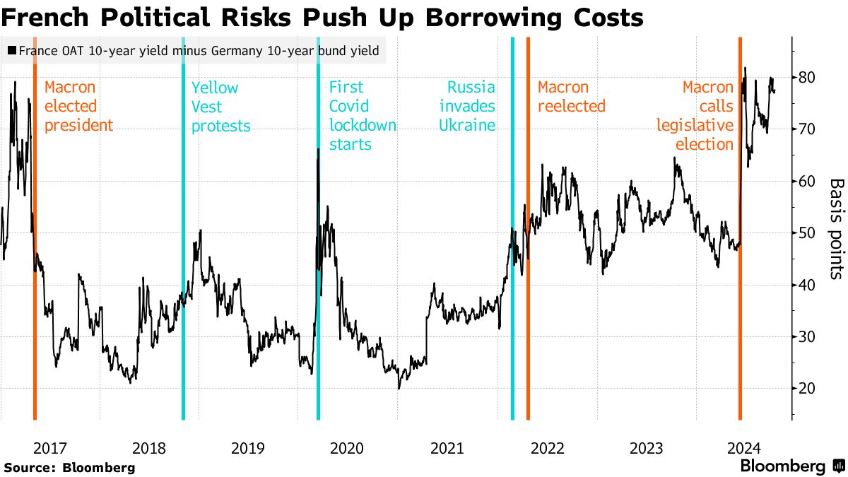 这一事件促使投资者抛售法国债券,使该国在十年期债务上支付的溢价从年初的不到50个基点上升至接近80个基点。