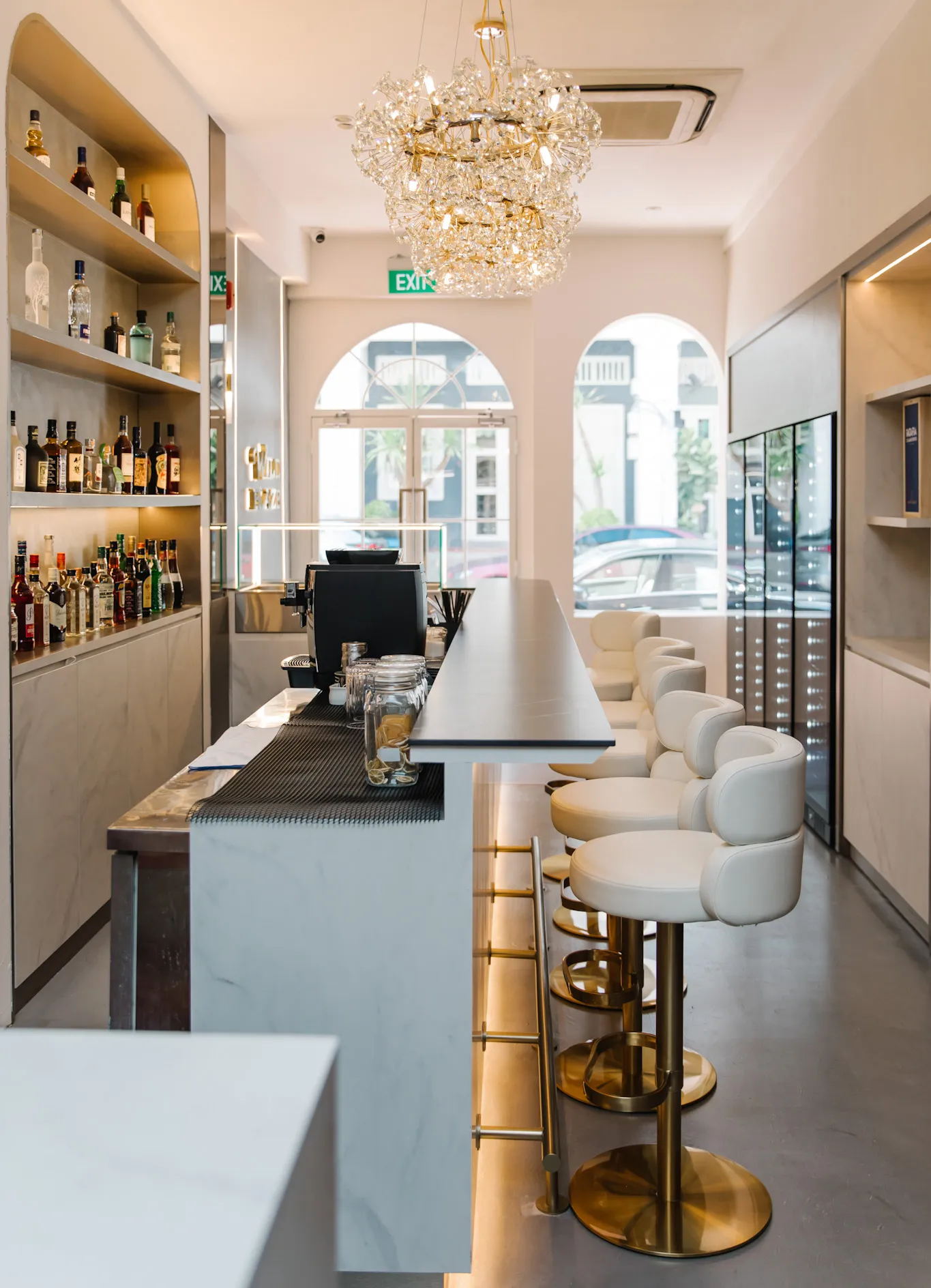 酒吧区域。来源:Wild Blaze 氛围。 装饰以米色、奶油色和白色为主,配以金色点缀,整个地方明亮而中性,不会分散人们对肉类、葡萄酒和生蚝玻璃柜的注意。