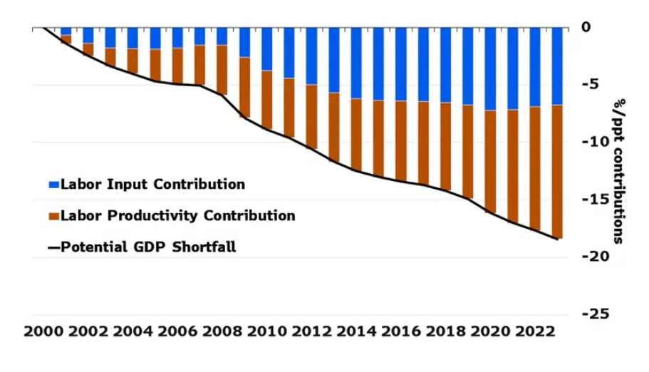 自货币联盟以来,欧盟的相对衰退已经持续了四分之一个世纪。彭博经济学的分析显示,如果欧盟的经济与美国保持同步,欧盟的经济将大约大3000亿欧元(3300亿美元)——足以使平均工人的收入每年增加约13000欧元。