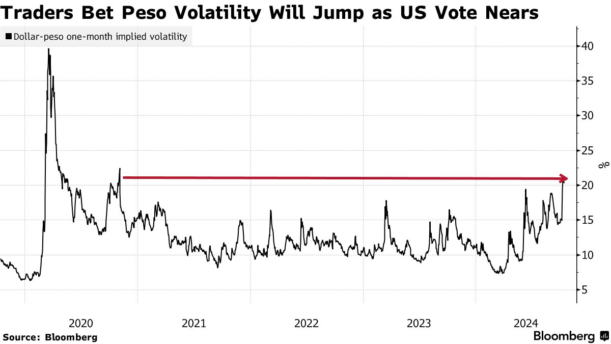 这一呼吁——尤其是其时机——远非共识。对许多人来说,押注比索的风险太大,因为如果唐纳德·特朗普赢得选举,他可能会征收进口关税。比索的一个月隐含波动率指标已升至四年前美国选举以来的最高水平。