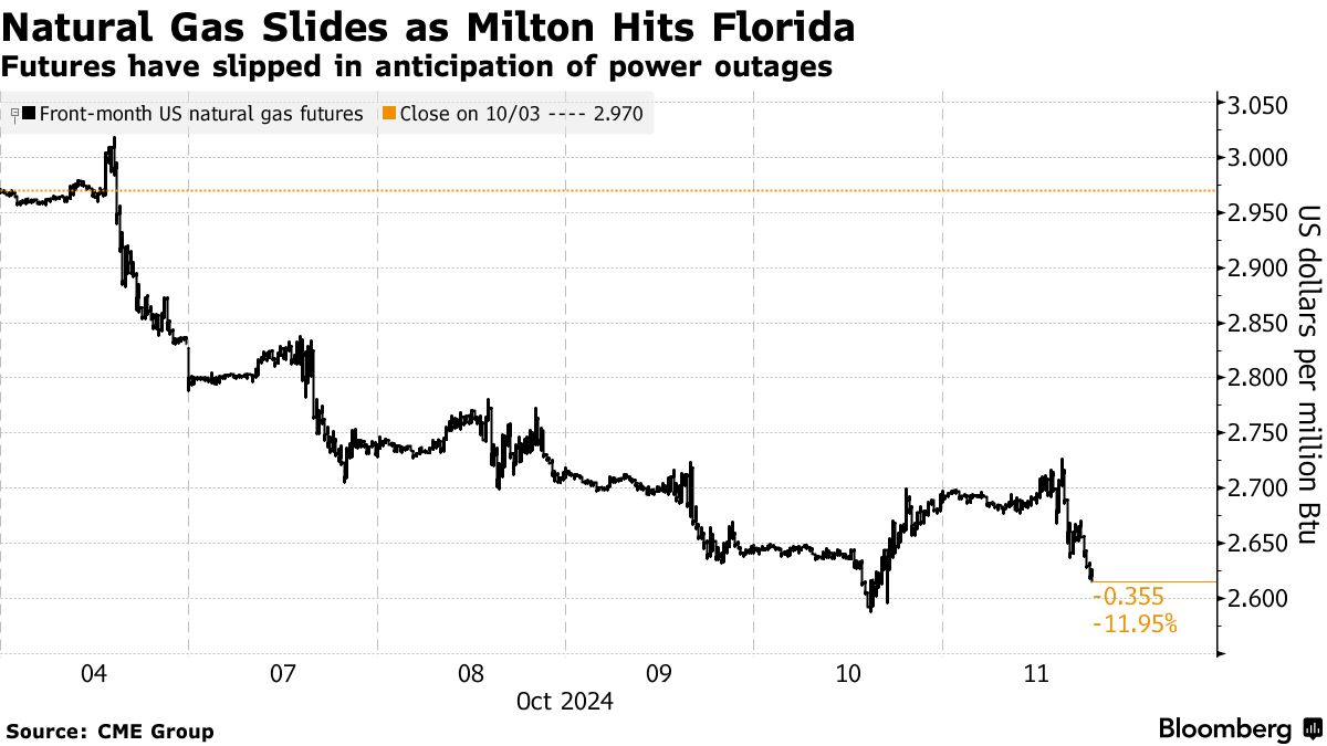 在米尔顿飓风来临前及其后,天然气期货下滑,因为数百万家庭失去电力。天然气用于为家庭和企业提供电力的发电厂供能,当停电发生时,天然气的需求通常会骤降。期货周比下跌近8%。