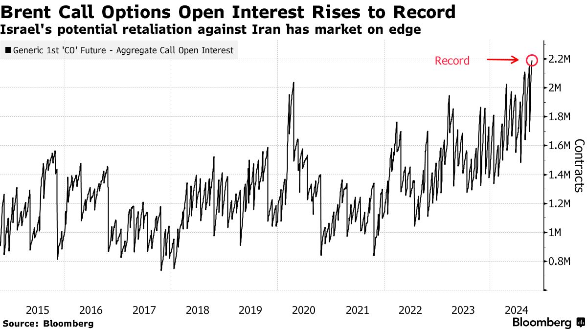 尽管石油期货的上涨有所降温,但为了防止价格飙升而购买看涨期权的行为仍在持续。截止周四,布伦特看涨期权的总未平仓合约——在价格上涨时受益——增加到创纪录的219万份。投资者在中东冲突的不确定性中继续感到紧张。