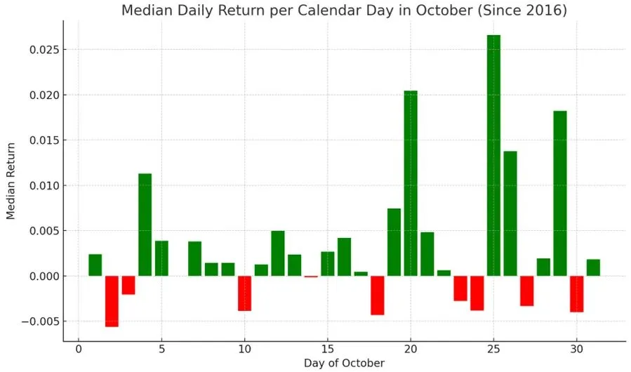 来源:Fundstrat全球顾问公司“历史数据表明,十月在加密市场的季节性强劲通常集中在下半月,”Fundstrat全球顾问公司数字资产战略负责人肖恩·法雷尔在一份报告中写道。
