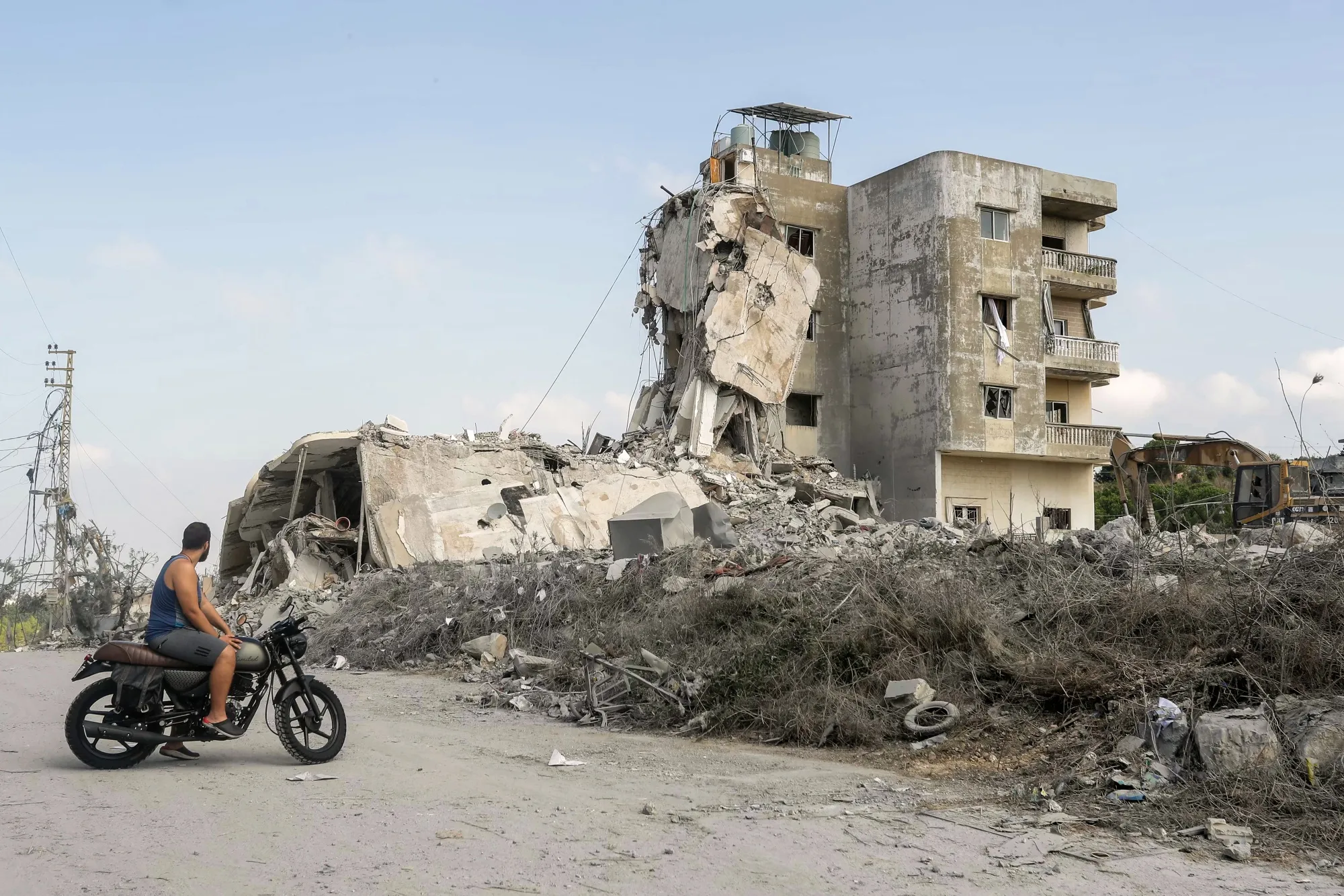 一名居民在黎巴嫩泽伊塔观看一座在以色列空袭中被毁坏的建筑,时间是10月14日。