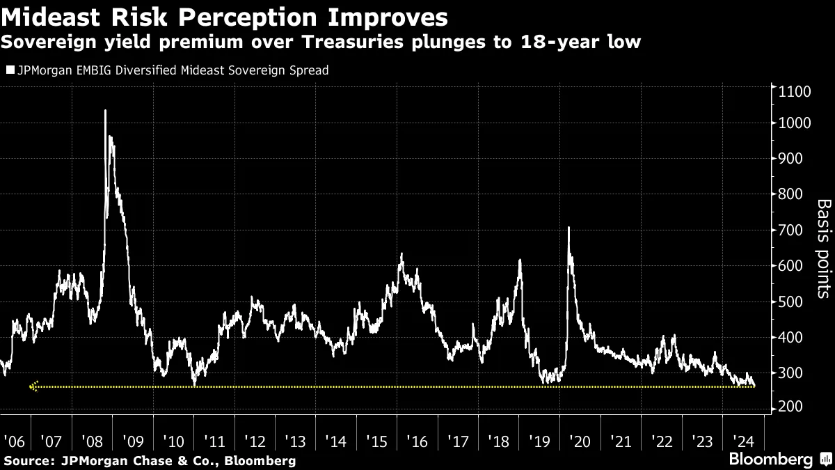 全球债券投资者对中东政府的信用状况变得最乐观,这是18年来的首次。他们要求购买该地区美元债券而非美国国债的额外收益率已降至262个基点,而1月份为324个基点。