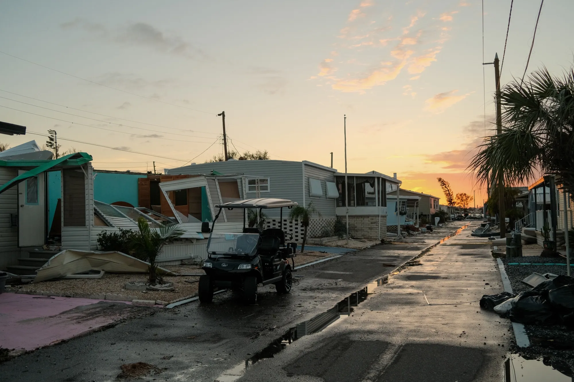 佛罗里达州圣彼得堡,10月10日,飓风米尔顿过后,一个受损的移动房屋公园。