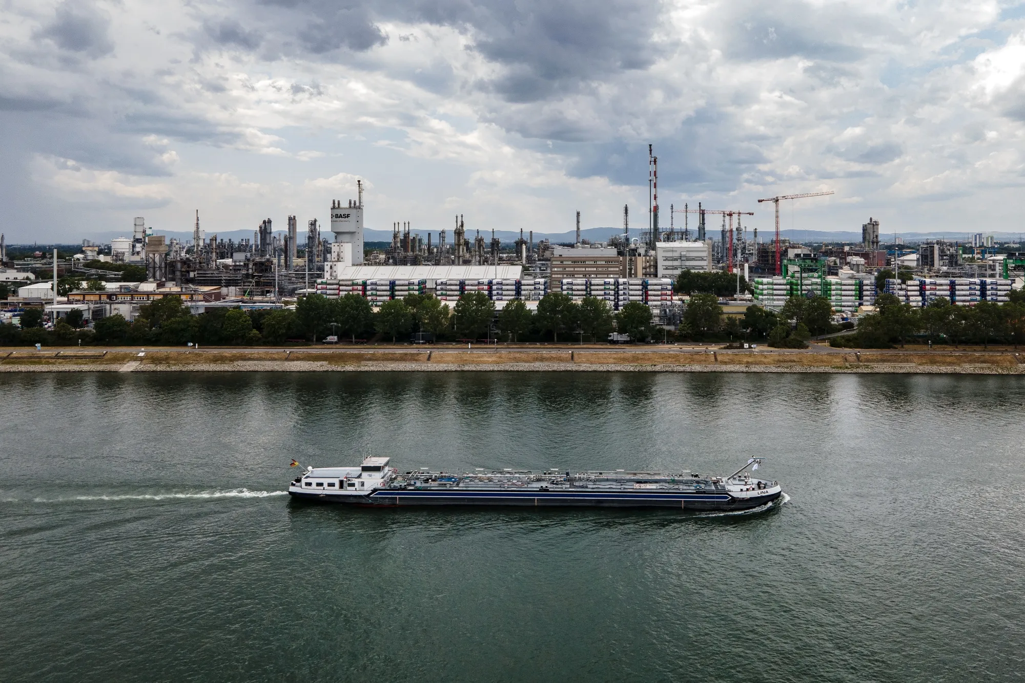 一艘油轮驳船经过德国路德维希港的巴斯夫化工厂,位于莱茵河岸边。