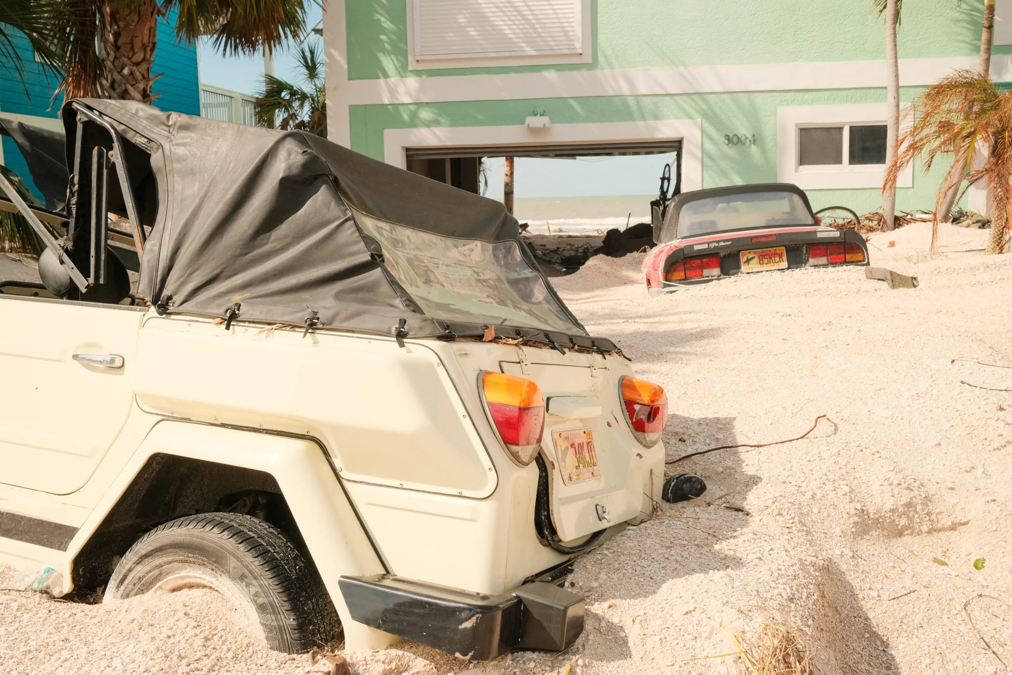 飓风米尔顿过后,佛罗里达州圣彼得海滩的汽车被沙子埋没,时间是10月10日。