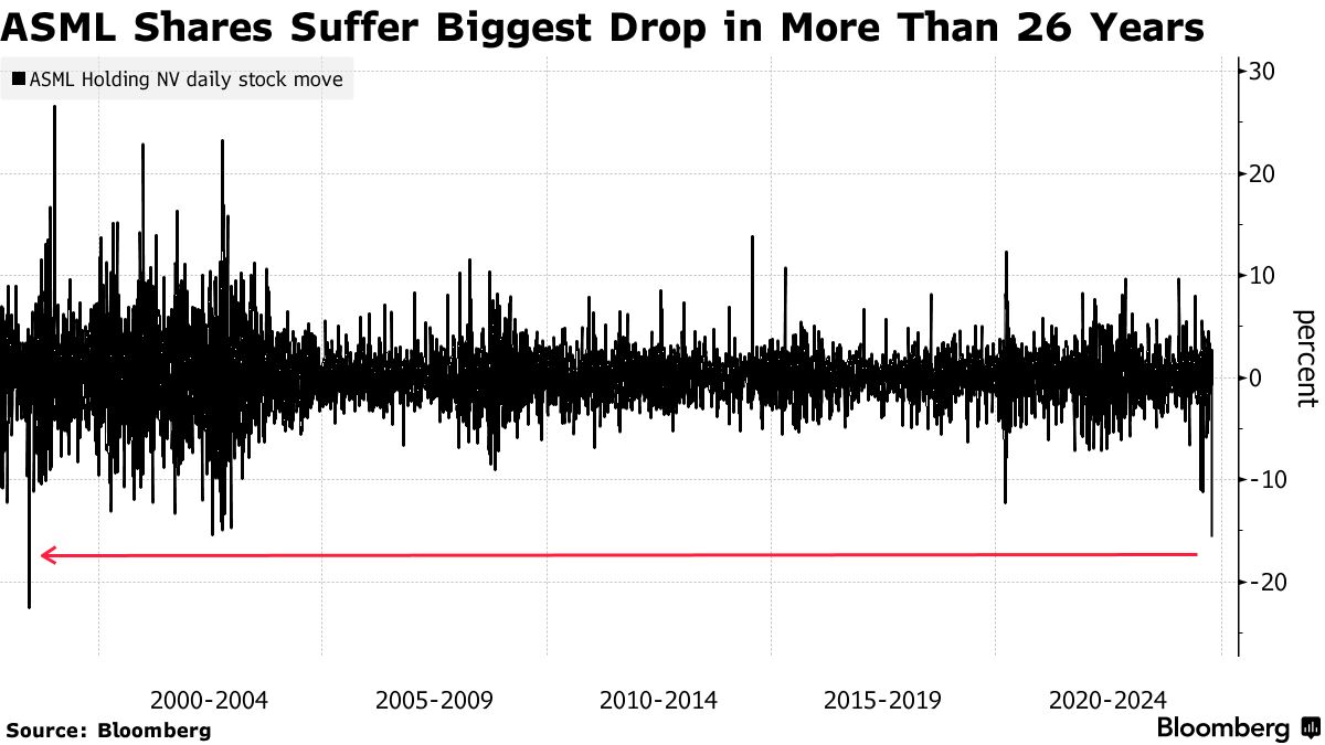 ASML控股公司的股票在26年来首次大幅下跌,因为它的订单仅约为分析师预期的一半,这对半导体行业的风向标之一来说是一个令人震惊的放缓。