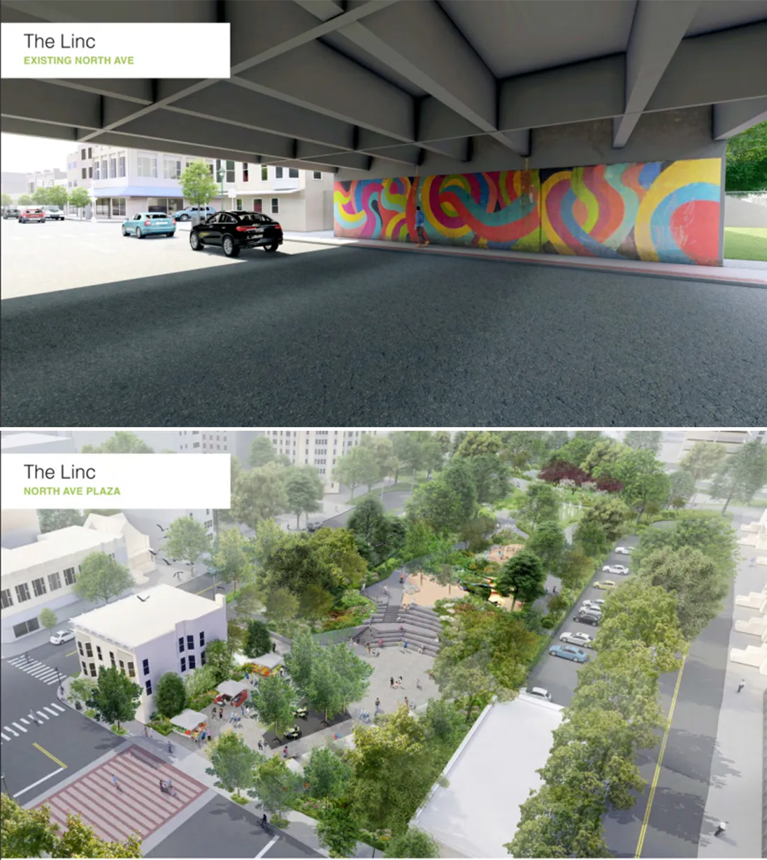 纪念公路今天(上)和LINC项目重新设计后(下)来源:Starr Whitehouse**联邦拨款如何改变了游戏规则?**一旦我们看到了资源,我记得和我们的专员[亚当·萨尔加多]交谈,并[说],‘我们可以进行经济发展,我们可以处理雨水管理。现在我们有更多资金,可以做更多事情。’