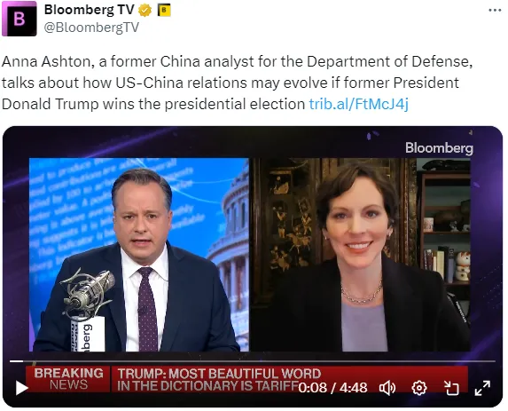 今天在彭博电视台的 权力平衡早间版中,主持人乔·马修和凯莉·莱因茨采访了安娜·阿什顿,前国防部中国分析师,讨论在潜在的第二个特朗普政府下,美中关系可能如何演变。