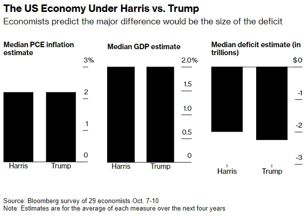 美国的通胀和增长前景 大致相同,无论哈里斯还是特朗普赢得选举,尽管在彭博社的调查中,经济学家们认为副总统在整体经济方面占优势。