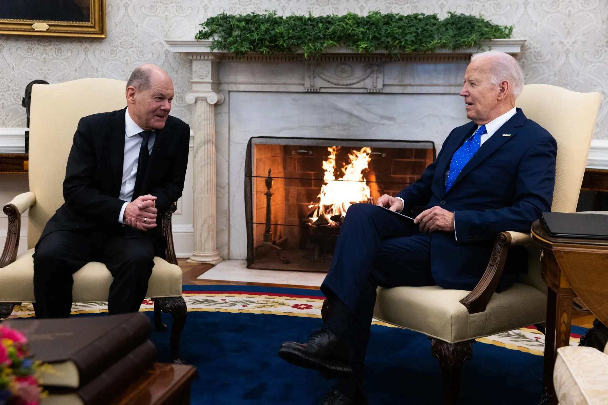 奥拉夫·肖尔茨和乔·拜登在华盛顿特区白宫椭圆形办公室的会议上,二月。