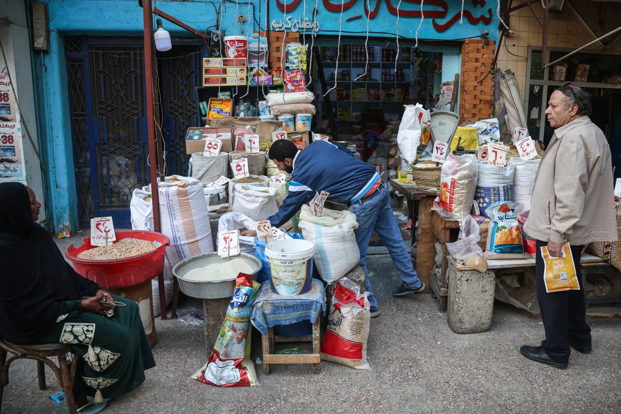 一位食品供应商在埃及开罗的赛义达·泽伊纳布食品市场整理待售的杂货。
