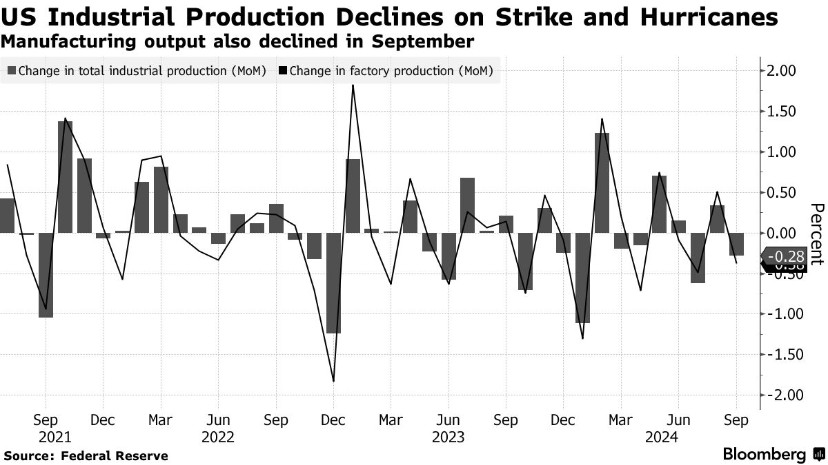 美国工业生产因罢工和飓风影响而下降 - 彭博社