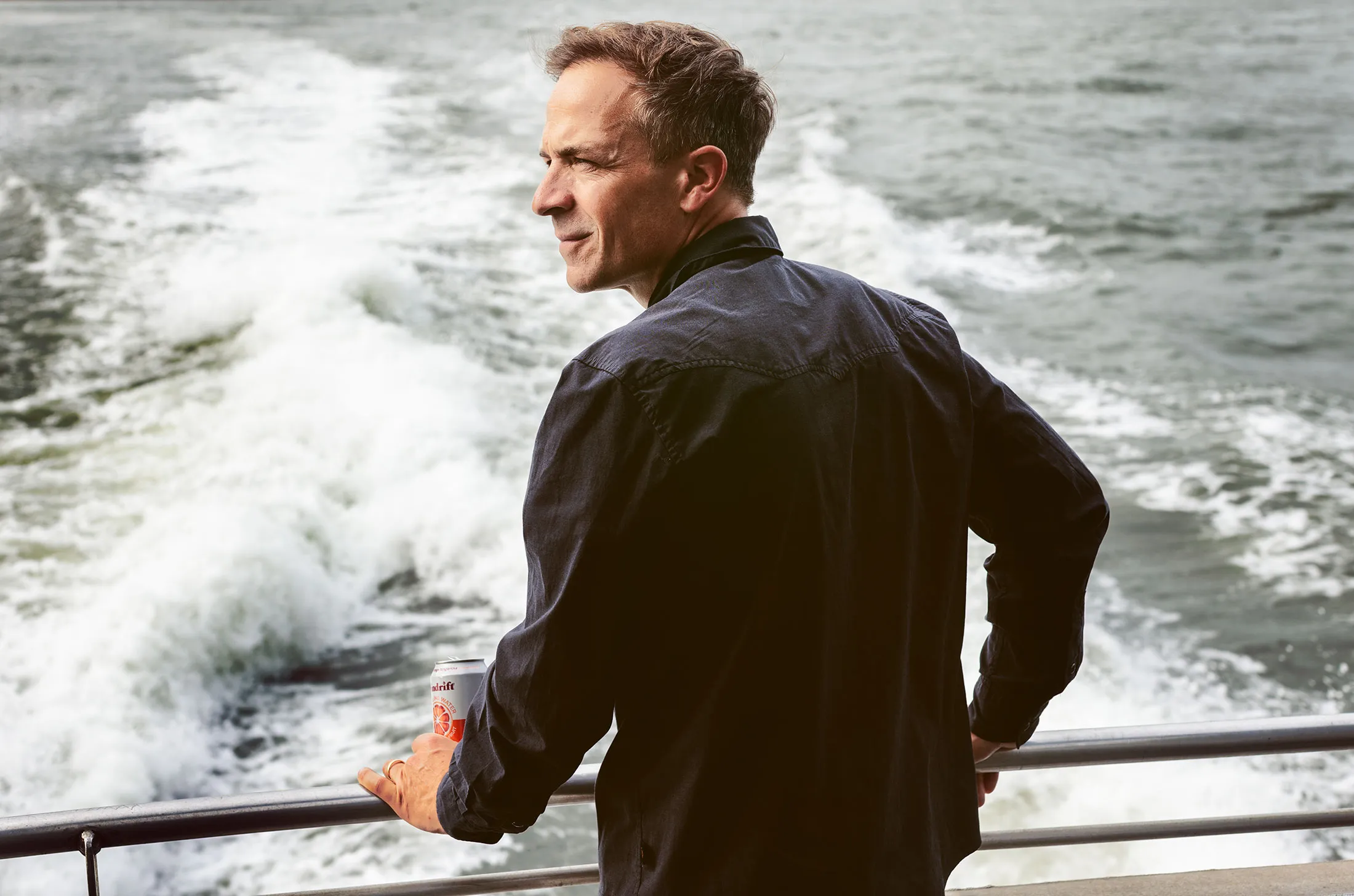 首席执行官比尔·克里尔曼在曼哈顿南街海港玩弄Spindrift的罐子。
