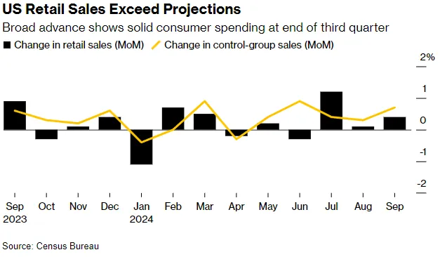 美国零售销售 在9月份增长了超出预期的0.4%,显示出 强劲的消费者支出 继续推动经济发展。