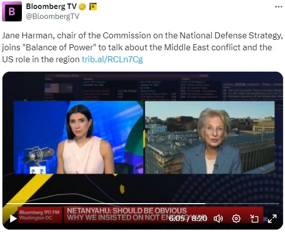 今天在彭博电视台的 权力平衡 早间版中,主持人乔·马修和凯莉·莱因兹采访了国家防御战略委员会主席简·哈曼,讨论中东冲突。
