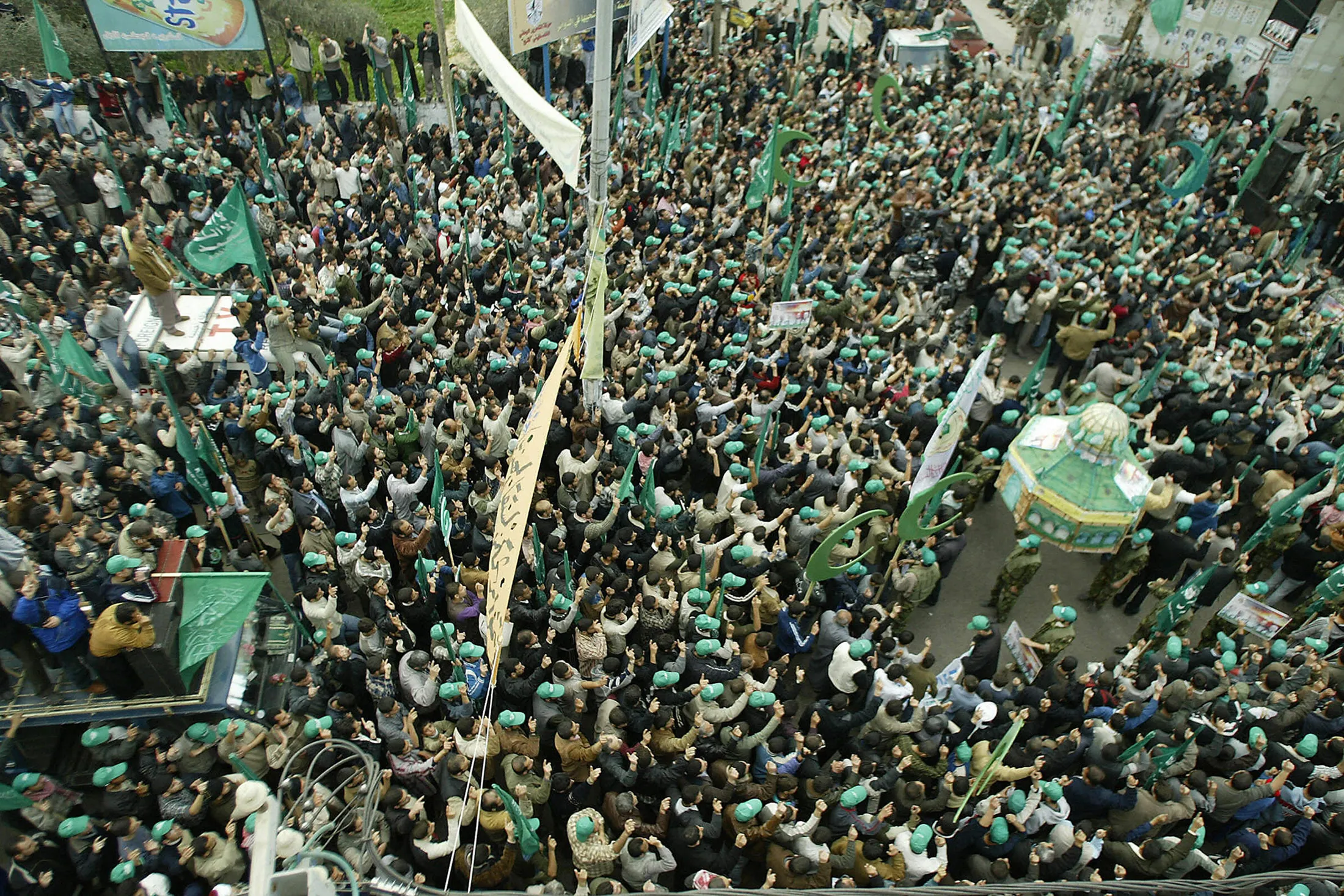 2006年,支持伊斯兰哈马斯运动的巴勒斯坦人在加沙市参加抗议活动。摄影师:Mahmud Hams/法新社/盖蒂图片社### 哈马斯在和平谈判破裂中扮演了什么角色?