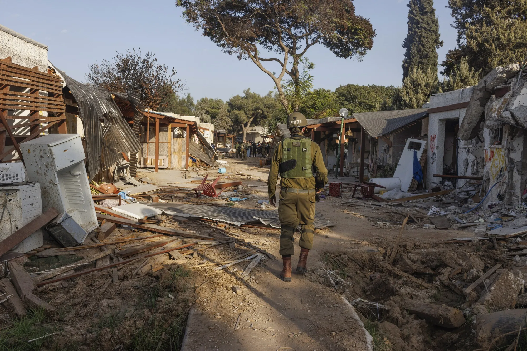 一名以色列士兵在以色列基布兹卡法阿扎查看在10月7日哈马斯袭击中被毁的房屋。摄影师:科比·沃尔夫/彭博社### 哈马斯为什么选择在10月7日袭击以色列?