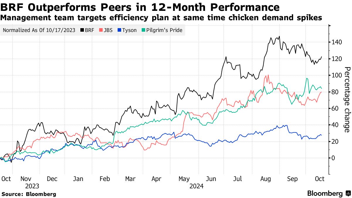 自从Marfrig Global Foods SA创始人在2022年掌控BRF SA的董事会——让全球第一的牛肉饼生产商对一家顶级鸡肉供应商进行监督——这家长期挣扎的禽类销售商已经显著复苏。在削减表现不佳的产品线和提升工厂生产力后,它在去年底重新盈利,结束了连续七个季度的亏损,其股票在过去一年中成为巴西基准Ibovespa指数的第二大表现者。