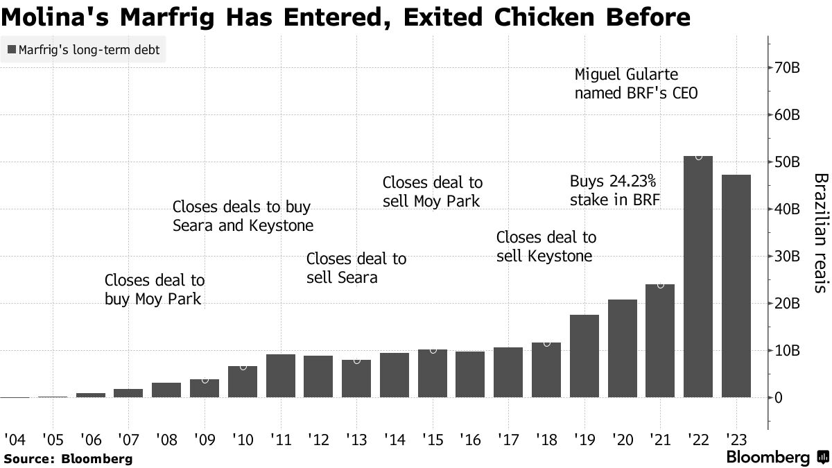 在BRF之前,莫利纳的马弗里格退出了多次早期尝试多元化进入家禽行业。在大约十年的时间里,马弗里格收购并随后转售了英国家禽生产商莫伊公园、巴西肉类公司塞阿拉食品和美国的基石食品,后者主要以其鸡肉块而闻名。每次收购都增加了马弗里格不断膨胀的债务义务,该公司在2010年代初被称为美洲“最负债累累的肉类加工商”。