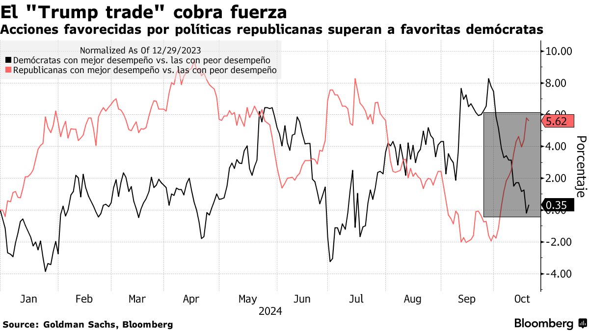 还有其他迹象表明“特朗普交易”正在增强。从十月初开始,高盛集团的股票篮子受益于共和党胜利的股票篮子明显超过了民主党篮子。
