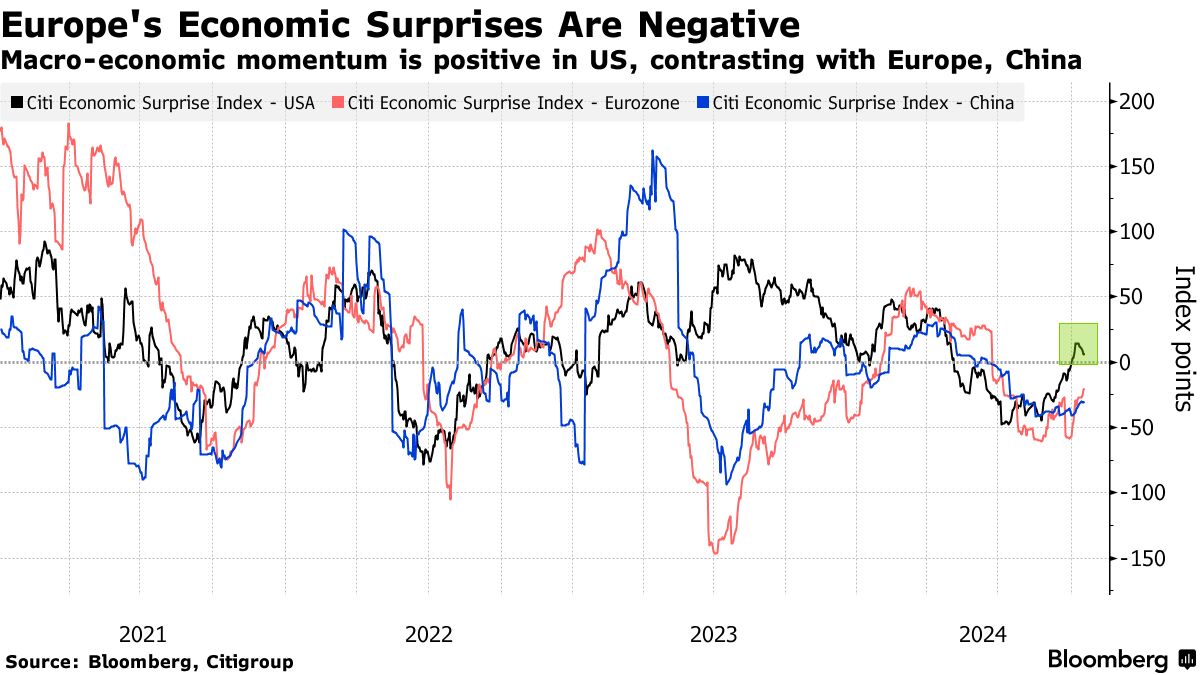 这种盈利差异突显了为什么Stoxx 600的交易估值比S&P 500低约40%的历史记录。这也是宏观形势差距的一个迹象:与欧洲股票不同,美国股票受益于稳健的经济和劳动市场。