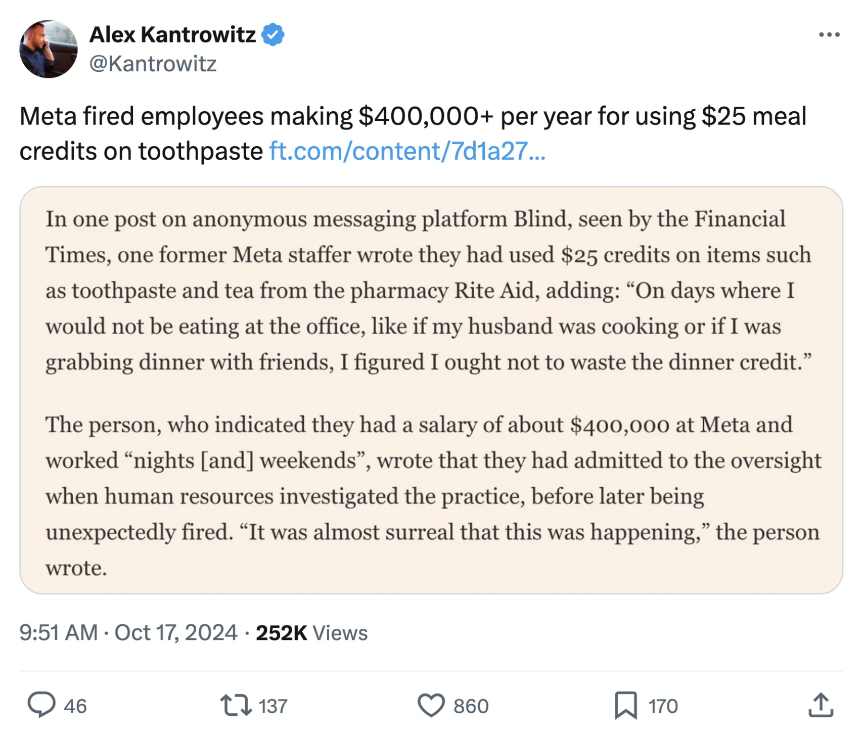 没错: 金融时报说Meta裁掉了大约二十名位于洛杉矶的员工,因为他们把餐费津贴花在了痘痘贴、酒杯和洗衣粉等东西上。 马特·莱文说:“你会在大银行看到这样的事情, 时不时。我想那里员工被解雇是因为滥用餐费津贴的员工是合规风险。不过,我不确定在Meta是否也是这样,虽然也许是。”无论如何,那些员工失去了在Meta长期就业的机会, 一个相当理想的工作地方。为了什么呢?一管佳洁士?啧。