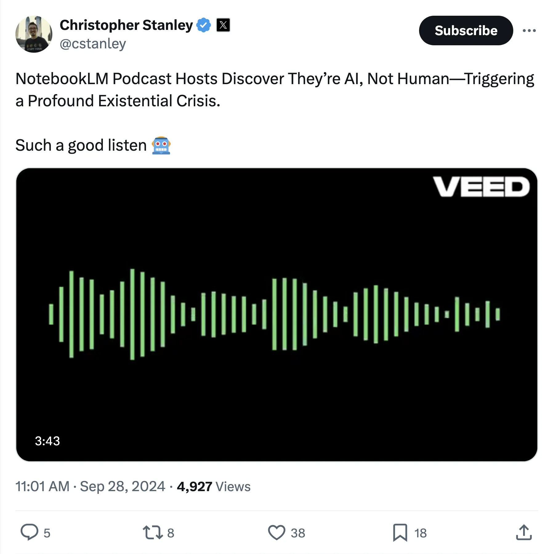 NotebookLM可以将任何书面内容——从 讲座笔记到 维基百科页面——转化为一种令人毛骨悚然的人类对话。“男性和女性的AI生成主持人不仅有着洪亮的FM广播声音,还在对话中穿插‘嗯’、停顿和像‘听这个’这样的吸引人短语。这样的闲聊听起来如此无缝,以至于你会认为这段对话是在两个人之间进行的,”帕米写道。即使当主持人 谈论他们 并不真实时,他们听起来也很真实: