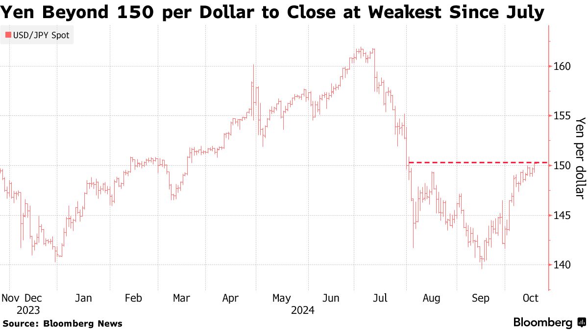 日元跌至关键的150水平,增加了干预风险 - 彭博社