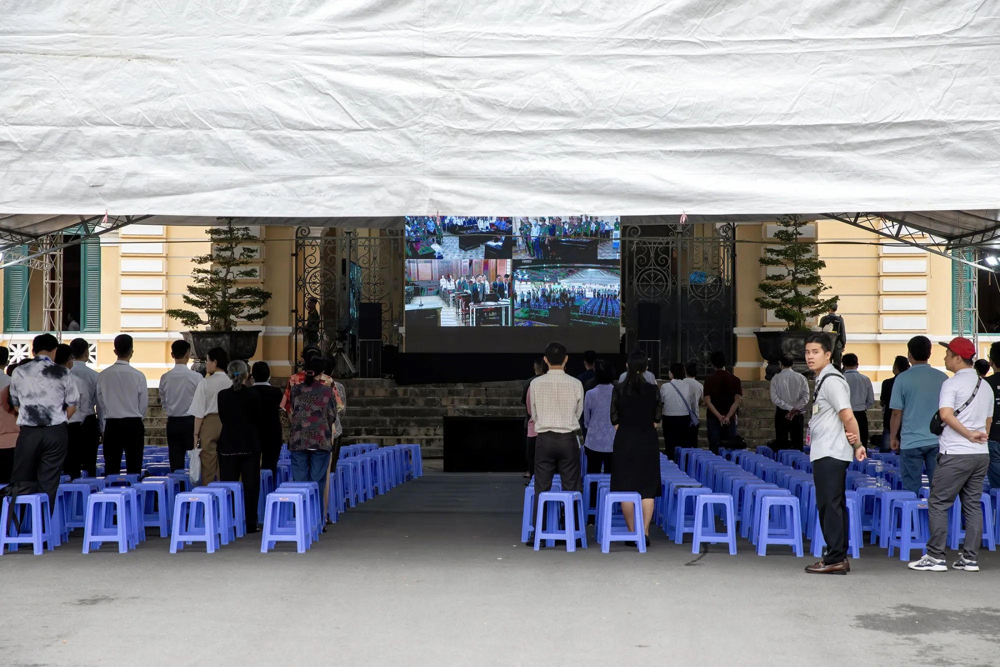 警方早早到达,以准备阮美兰的 第二次审判。这位声名狼藉的越南房地产大亨在四月已经被判定为策划了一起 123亿美元的欺诈案,并被判处死刑注射。五个月后,在胡志明市中心人民法院外,警察架起了一个巨大的电视屏幕,并在一个巨大的防水布下安排了蓝色塑料凳子,以便人们可以观看第二次审判的直播,无论天气如何。果然,人群来了。