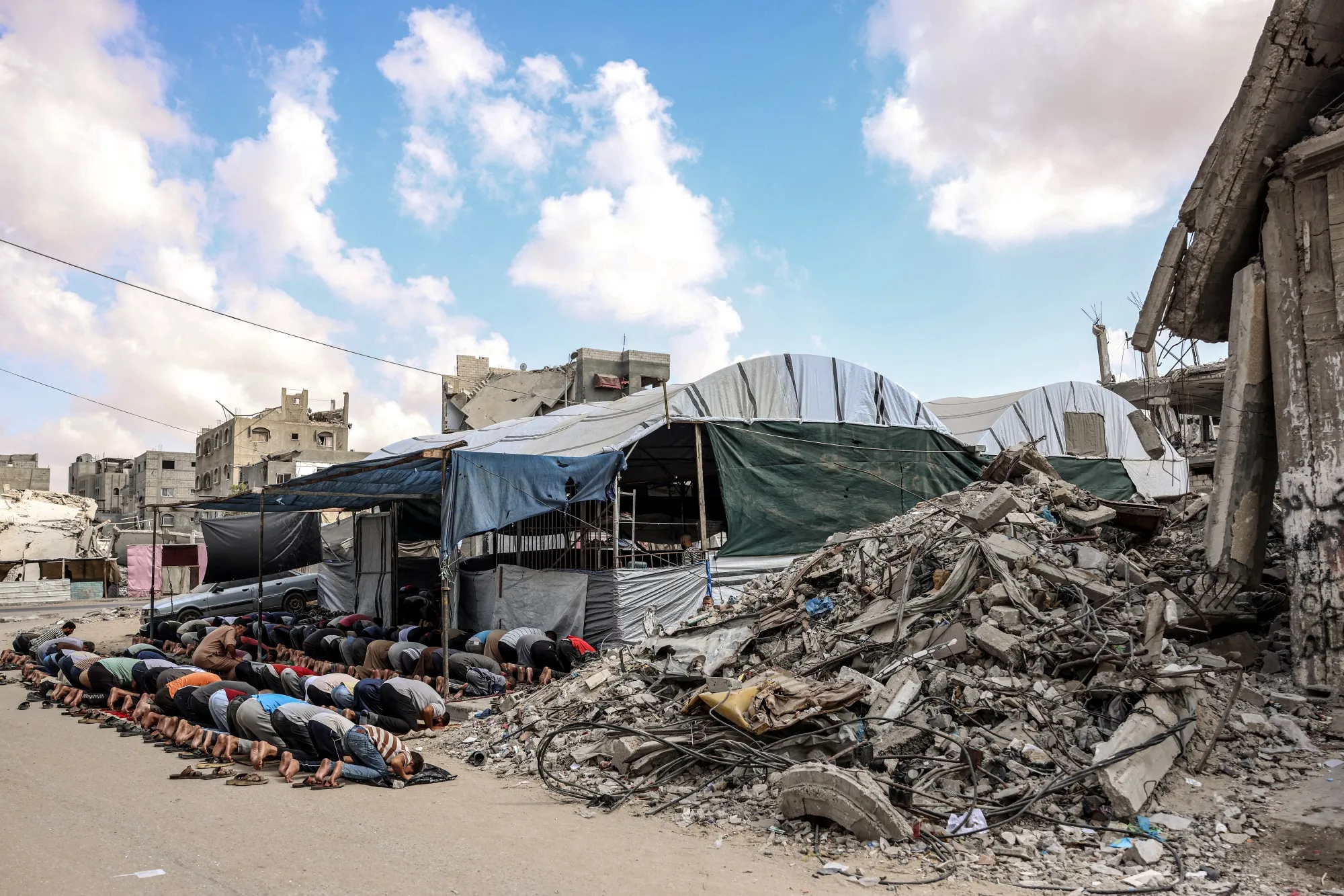穆斯林朝圣者在加沙的汗尤尼斯附近的废墟中祈祷,时间是10月18日。