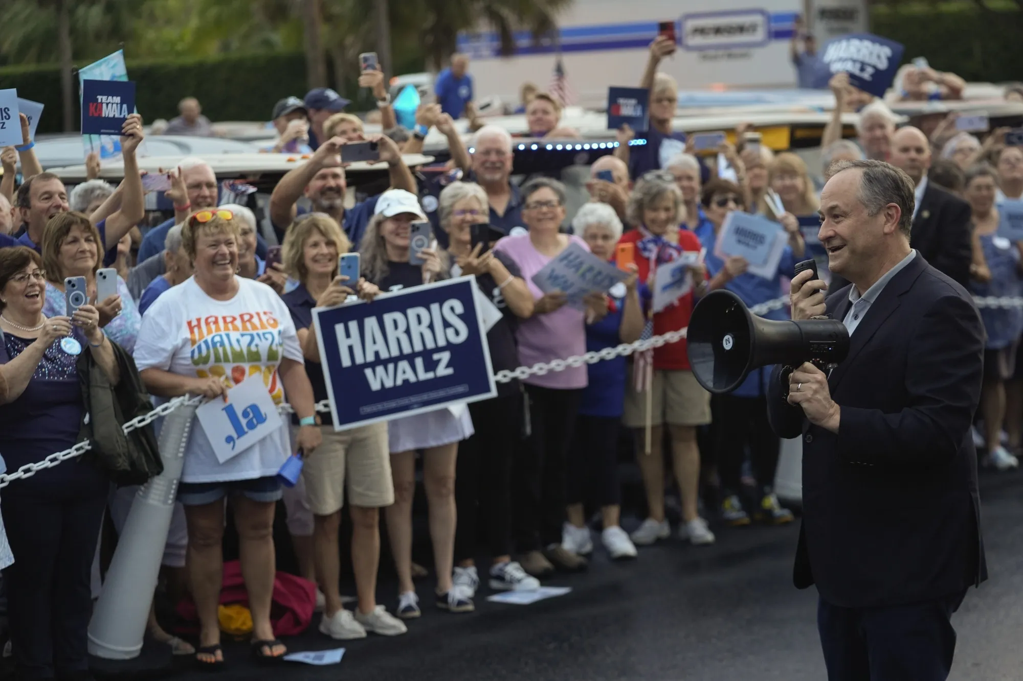 第二位绅士道格·埃莫夫在2024年9月13日的村庄支持他的妻子、民主党总统候选人副总统卡马拉·哈里斯的高尔夫球车游行开始时发言。摄影师:Rebecca Blackwell/AP Photo佛罗里达大学的政治科学教授迈克尔·麦克唐纳表示,共和党在选民中的百万优势可能“夸大了佛罗里达的实际情况。”这排除了在过去两次全州选举中没有投票的人,而晚注册的选民通常来自年轻的首次投票者,他们往往倾向于支持民主党。尽管如此,他仍然称共和党的优势“非常显著。”
