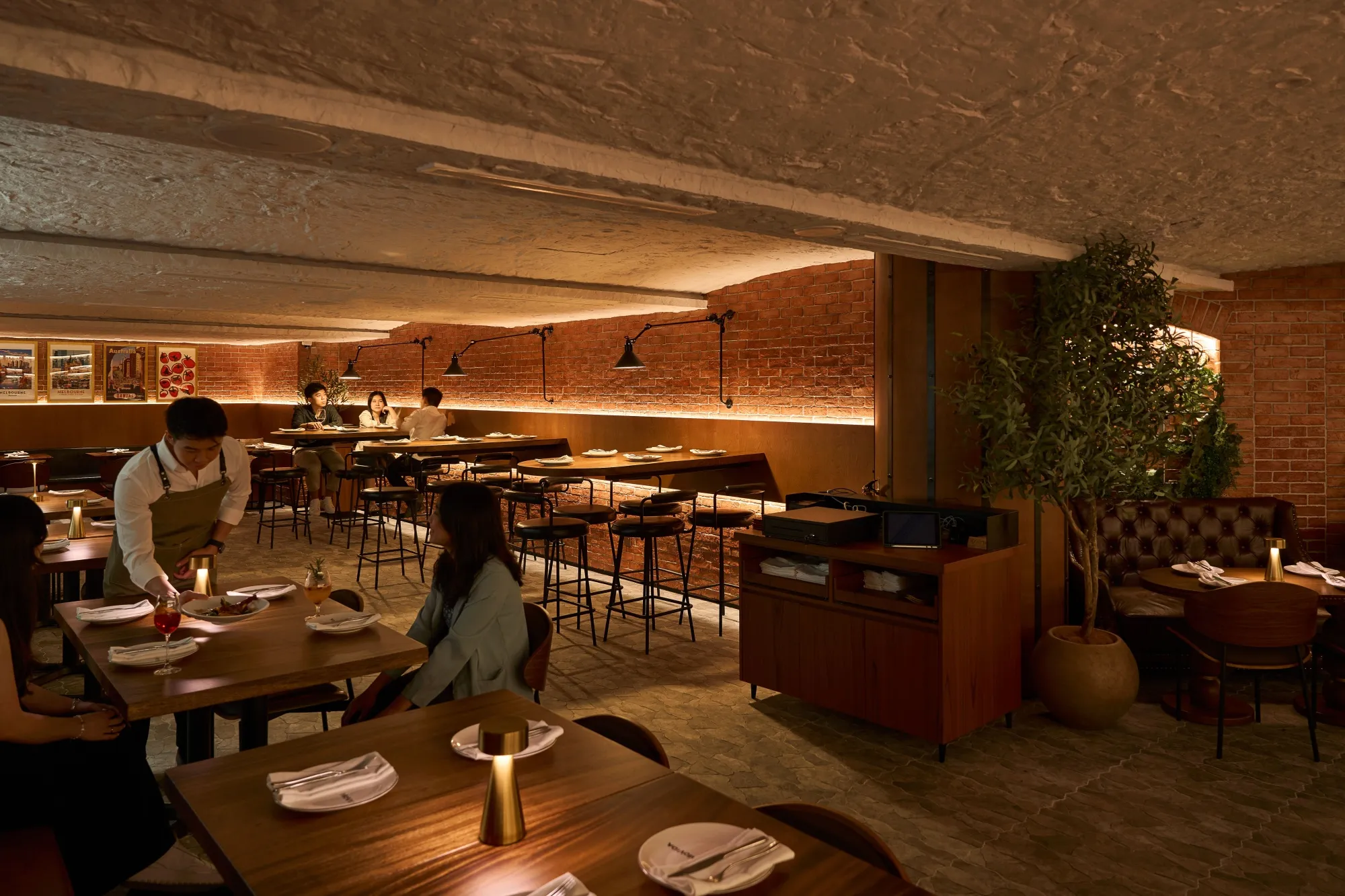 MoVida的餐厅。来源:MoVida**氛围。**就像走进一个地下酒窖。想象一下石质低天花板、砖红色墙壁和柔和的灯光。感觉并不像是在购物中心用餐(这有时会是一个非常暴露和混乱的体验)。
